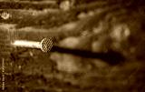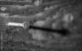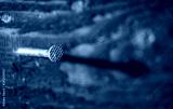 A nail sticks out of a wooden board.