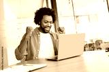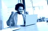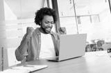 Happy african-american curly male freelancer excited about job offer, raising hands and laughing, man celebrating successful deal or online win, screaming yes, lucky guy received good news by email