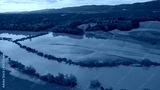 AERIAL: Picturesque countryside with a swollen muddy river overflowing its banks