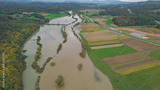 AERIAL: Stunning view of greatly increased river water level flooding rural area