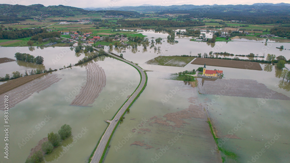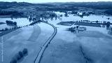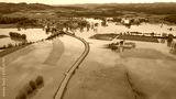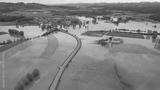 AERIAL: Incredible view of large farmland area submerged under muddy floodwater