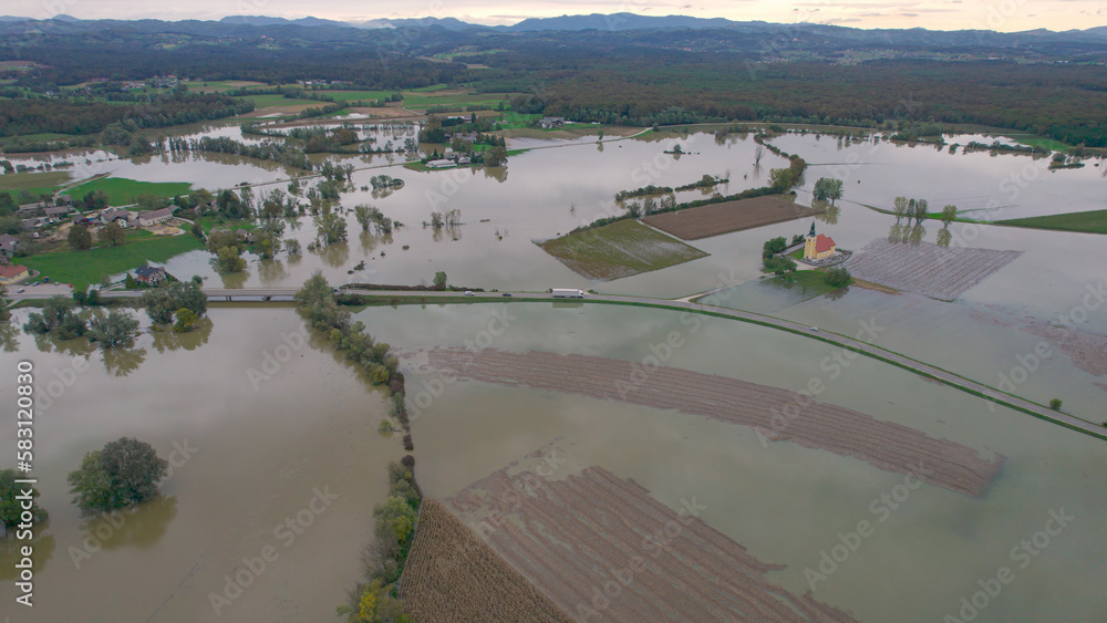 AERIAL Large agricultural area submerged under muddy floodwater near the village