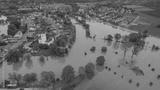 AERIAL: Lovely village in the countryside is surrounded by muddy flood water