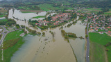 AERIAL: Picturesque village surrounded by floodwaters of overflowing rivers
