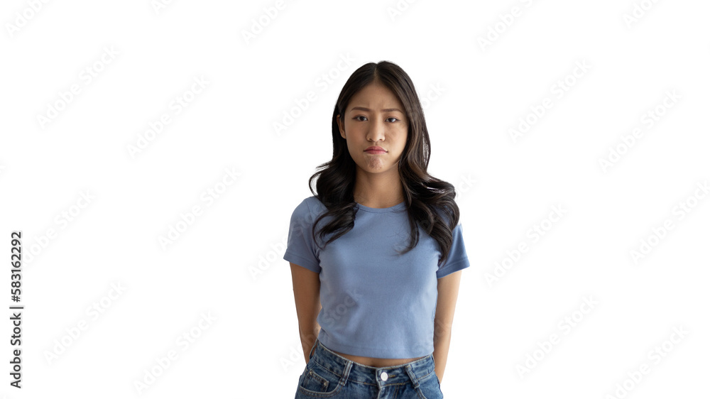 Woman made a grimace and was offended by the small matter, Sad face, Pouting sad expression, bored, Drama queen, Woman isolated from background, PNG file.