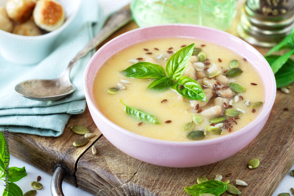 Delicious homemade Canellini bean creamy soup served with seeds and leaves of basil in a bowl