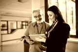Young pharmaceutic seller explaining something to doctor in hospital.