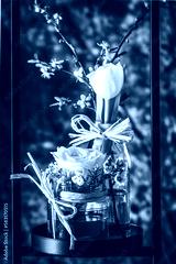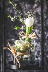 Spring decoration with white rose and tulip in a modern black metal stand, gray background, vertical