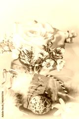 White rose and spring flowers in mason jar decorated with feathers and quail egg, vertical