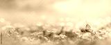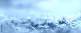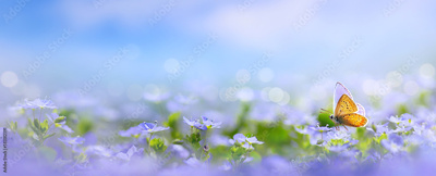 Beautiful blurred spring nature background with blooming meadow and blue sky on a sunny day. Butterfly and delicate blue flowers