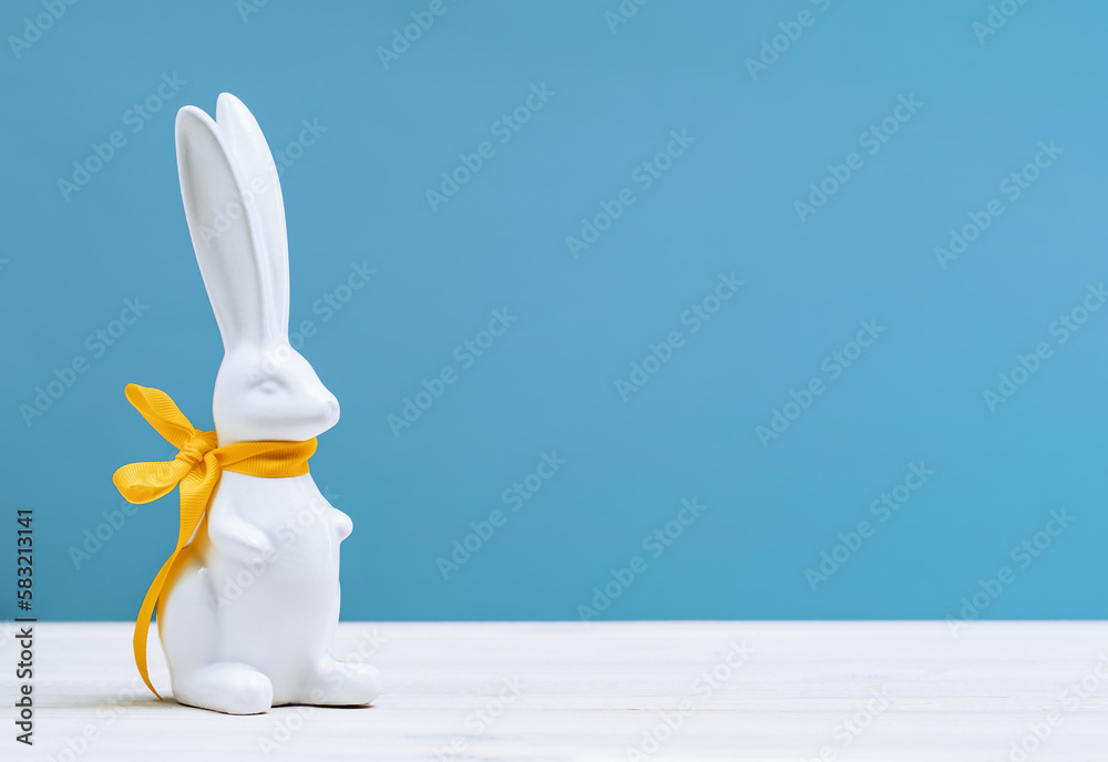White Easter bunny with yellow ribbon bow on white table. Happy Easter banner with copy space