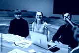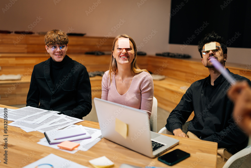 Cheerful business team at corporate training, team building activity, diverse employees group. Multiethnic startup team playing guessing game with sticky notes on forehead after work for entertainment