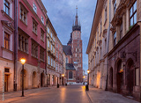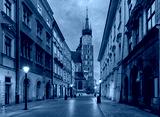Krakow. Market square in the night lights at sunrise.