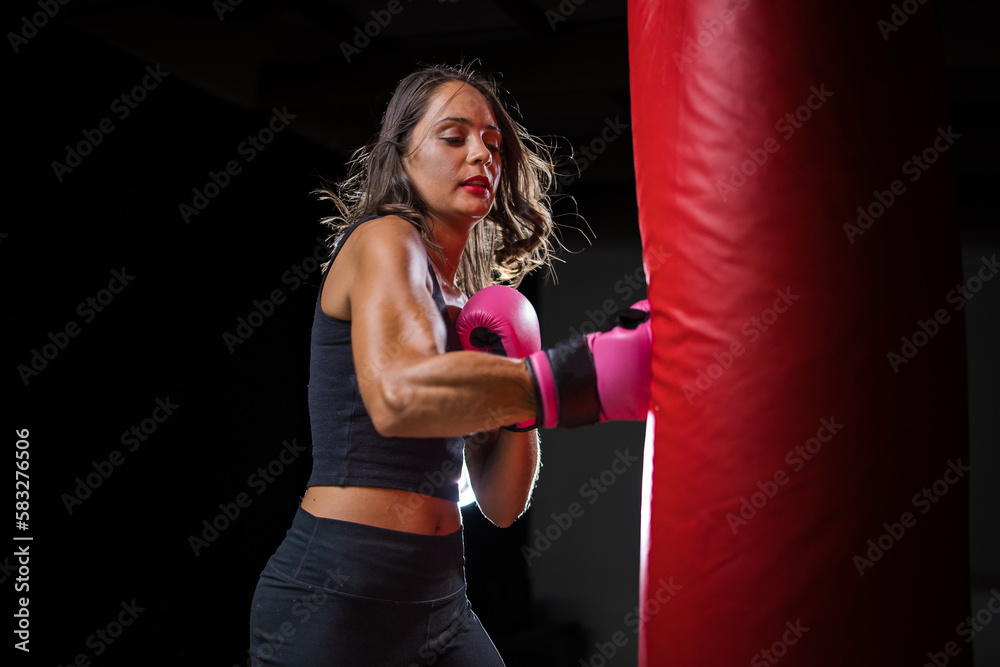 Dark Haired Girl Boxing a Punching Bag in a Moody Setting