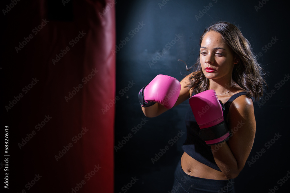 Dark Haired Girl Boxing a Punching Bag in a Moody Setting