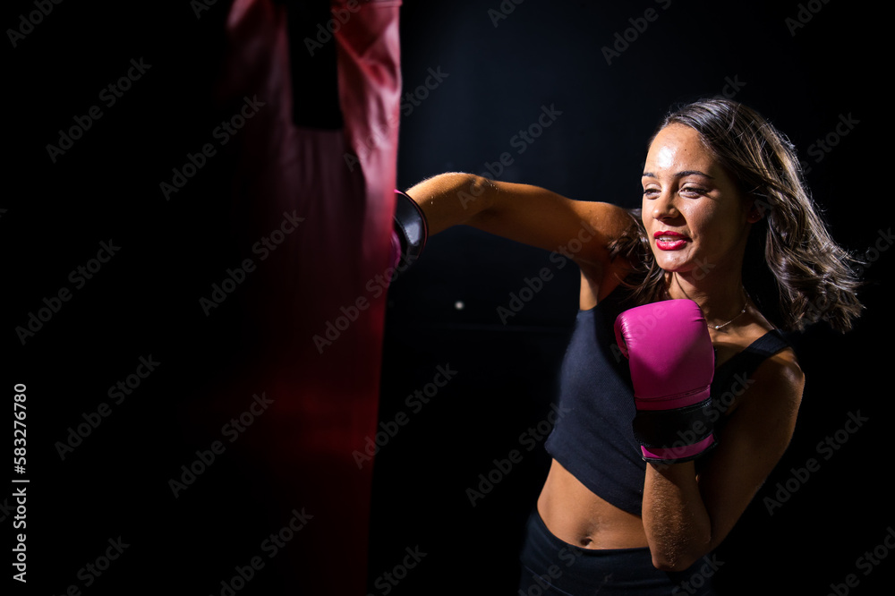 Dark Haired Girl Boxing a Punching Bag in a Moody Setting