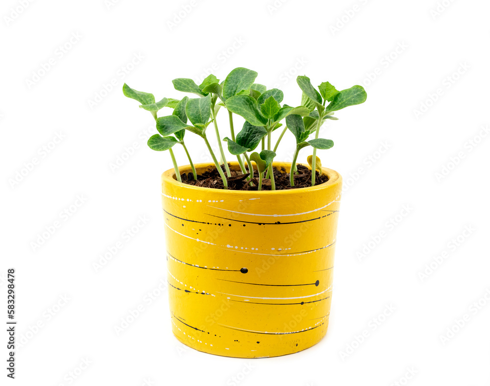 Young green plants seedlings in yellow pots isolated on white background. Ecology and Environmental. Earth day concept.