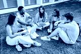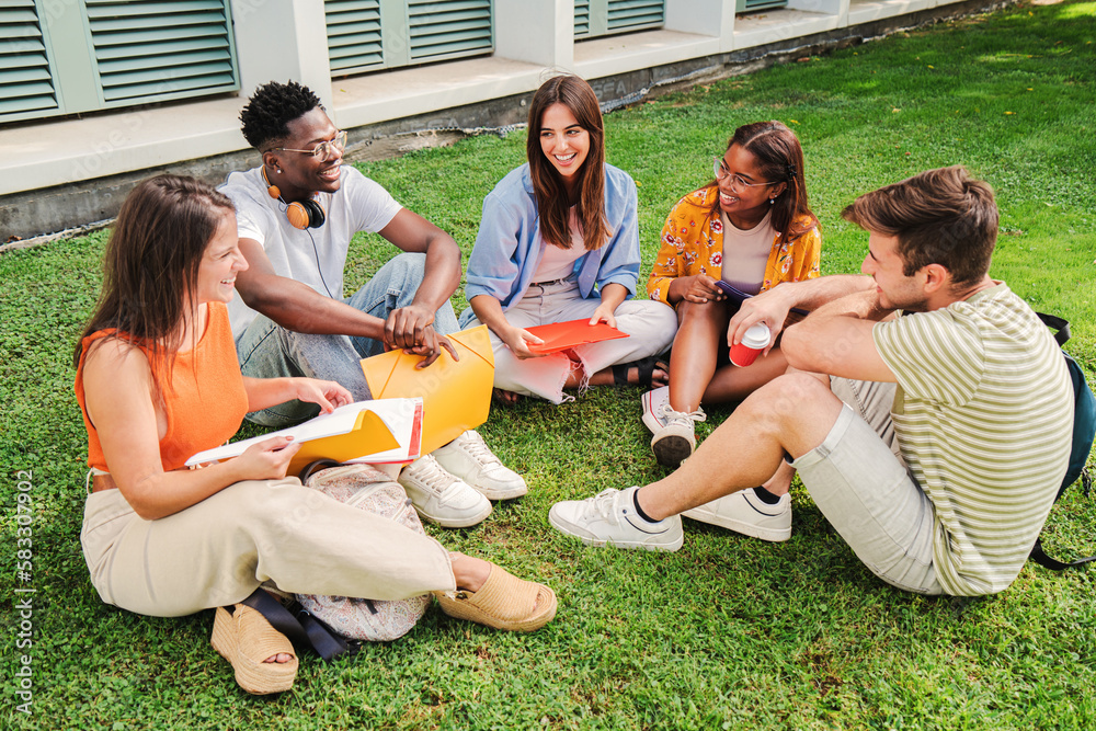 Group of multiracial teenage students sitting on the lawn, talking and smiling together at university campus. College young friends sleadning and tudying on the grass. Education concept. High quality