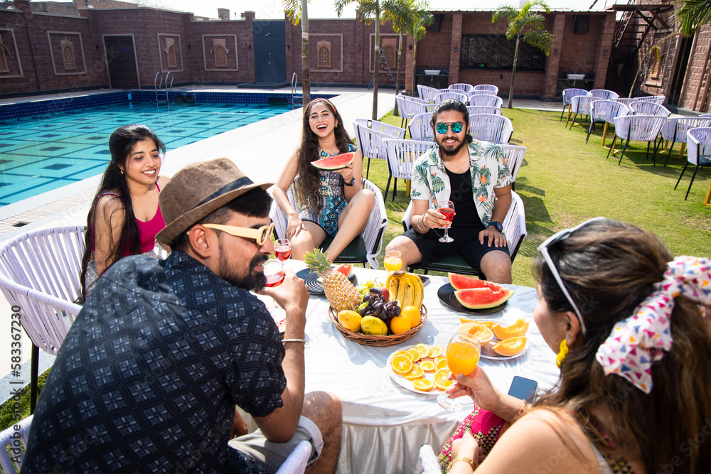 Group of indian friends enjoy fruits and juice at outdoors summer party and picnic, Young people having fun together, Vacations and holidays.