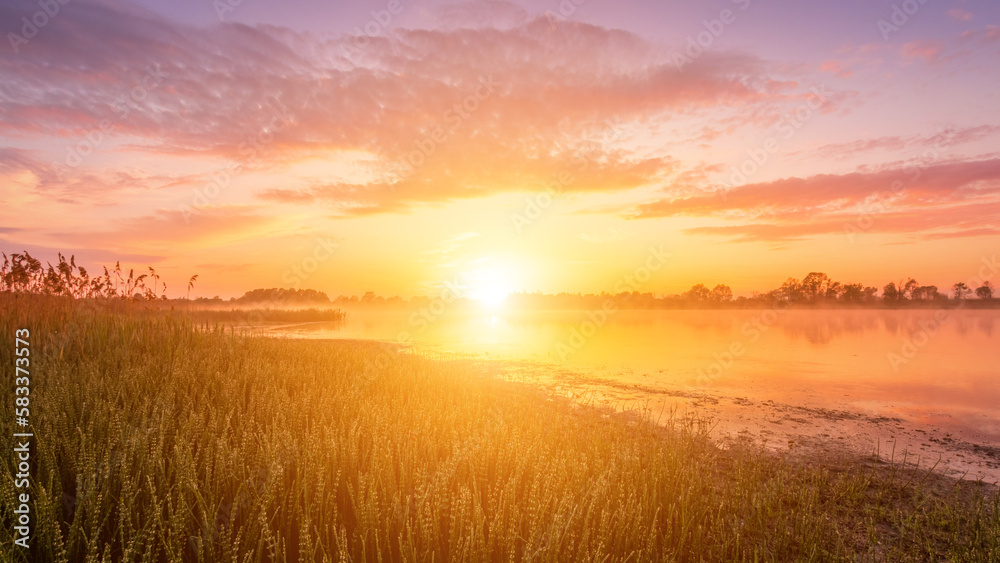 Scenic view of beautiful sunrise or dawn above the pond or lake at spring or early summer morning.