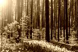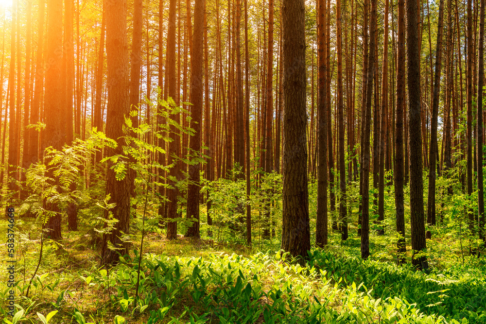 Sunset or dawn in a pine forest with lilies of the valley blooming on the ground.