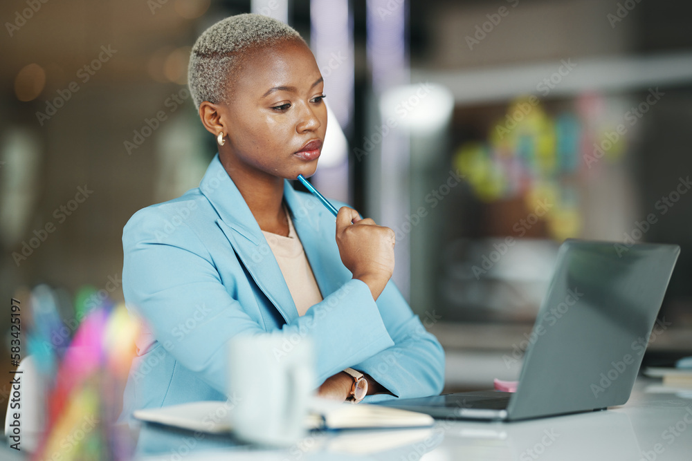 Laptop, idea and a serious business black woman in her office on a review, proposal or project. Work, focus and thinking with a female employee reading an email or doing research while working
