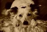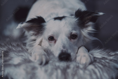 Hund, Border Collie blickt in die Kamera und liegt auf einem Fell