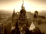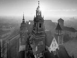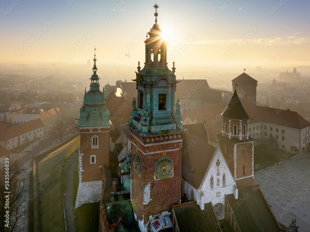 Widok Zamku Królewskiego na Wawelu o wschodzie słońca z drona