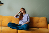 Portrait of tired exhausted woman with redhaired sitting on yellow sofa with eyes closed, touching head with hand. Frustrated female pondering problems after divorce, loosing beloved person.