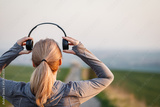 Woman with headphones getting ready for running on road. Fitness activity outdoors