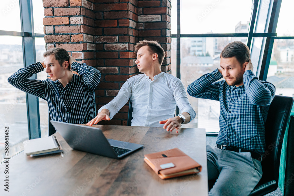 A young male office worker looking upset and worried about his job security after experiencing a work-related failure on his laptop. A business team of three men feeling disappointed and frustrated