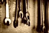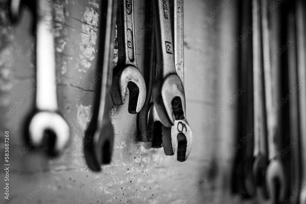Llaves mecánicas colgadas en panel de un taller mecánico. Fotografía en blanco y negro