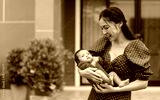 mother holding and playing with newborn baby in front of the house