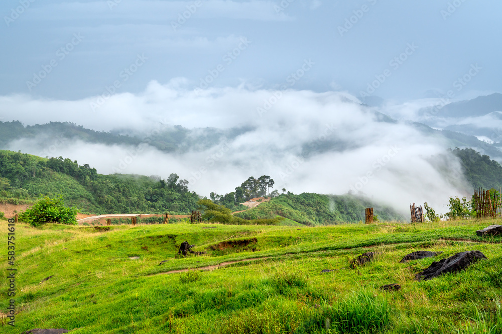 Panoramic view of sunrise with a trail going through a valley filled with white clouds in the Tak Po mountains in Tra Tap commune, Nam Tra My district, Quang Nam province, Vietnam