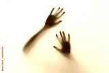 Defocused hand silhouette behind frosted glass in black and white mode, halloween concept