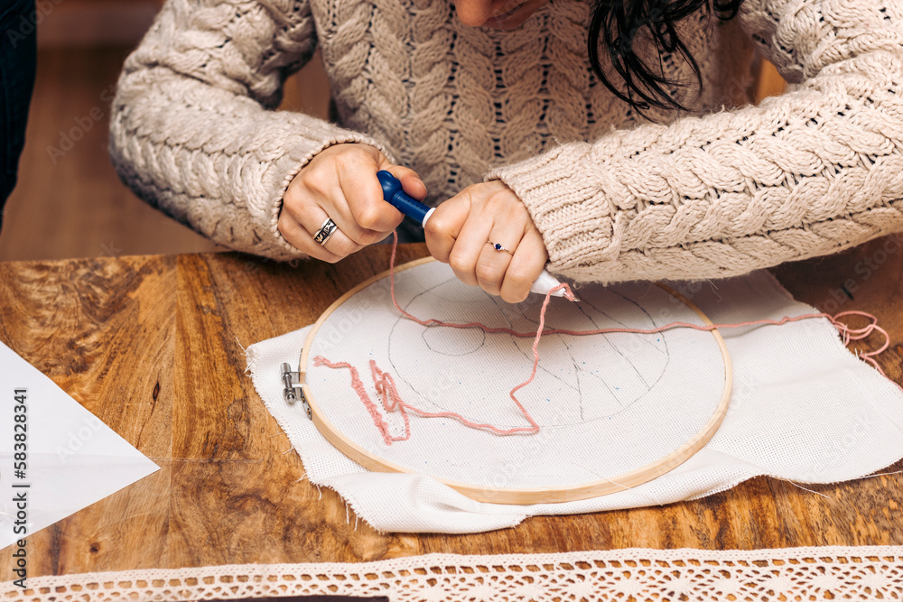 Punch Needle Workshop. Needlework. Young girl adjusting knitting needle