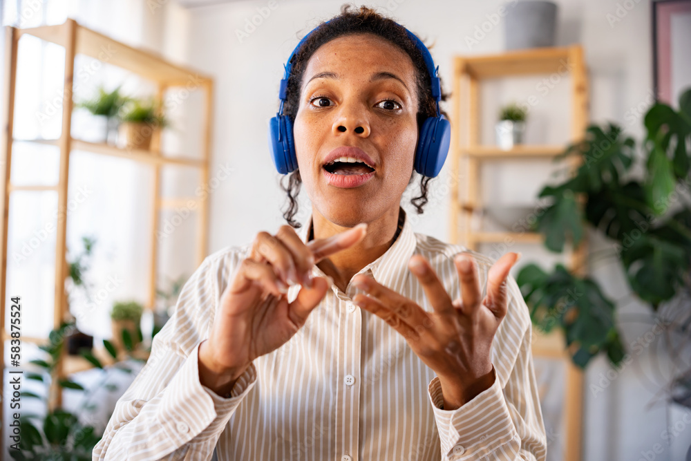 Young smiling African-American woman with headphones working as a remote educator. Online support.