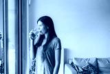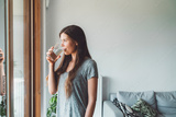 Young woman with long brown hair standing by the window looking out while drinking a glass of water and taking her vitamin pills