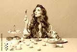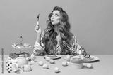 Food pop art of beautiful girl with long hair sitting at table holding cutlery and eating over green background. Colorful eggs on table