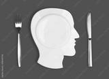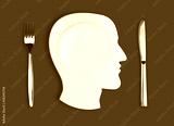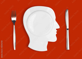 Knife, head plate and fork on red background