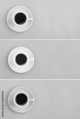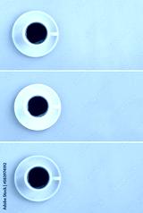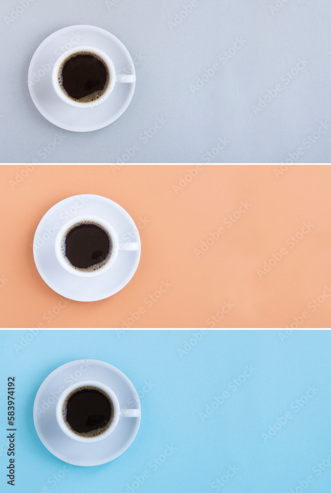 Cup of black coffee on the colored background. Copy space. Top view.