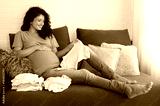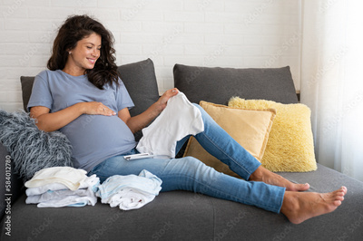 Beautiful mother-to-be looking cute baby clothes. Pregnancy and child anticipation.