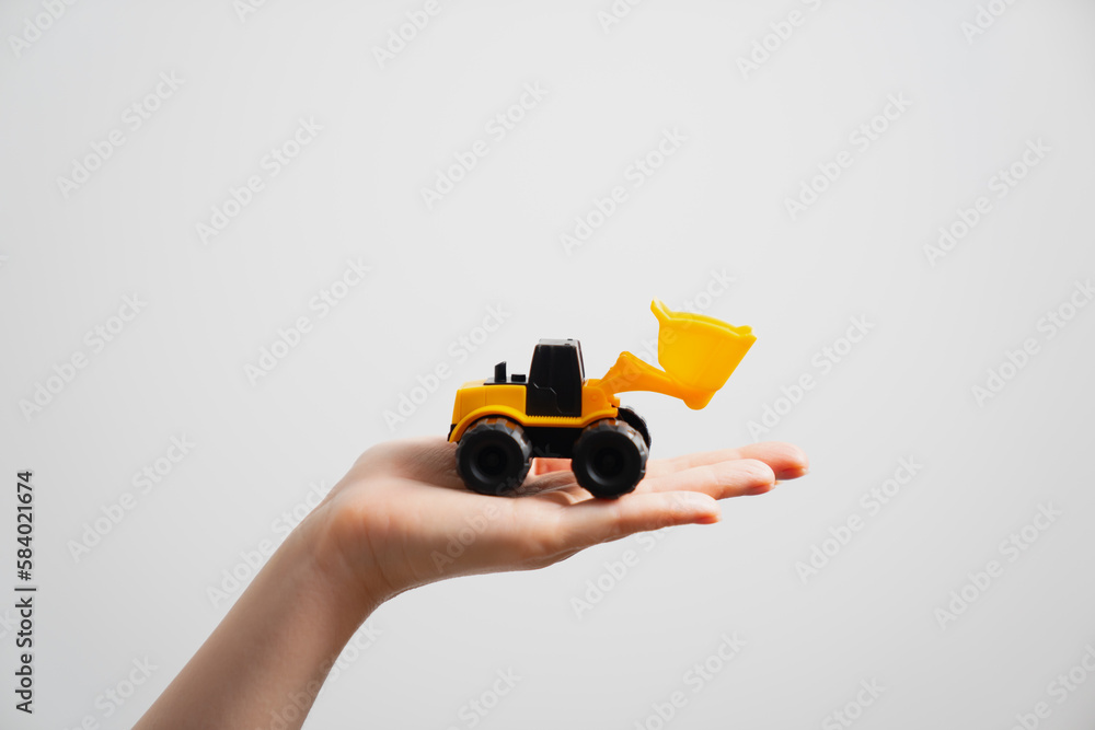 Female handle holding earthmoving equipment construction small plastic toy wheel loader