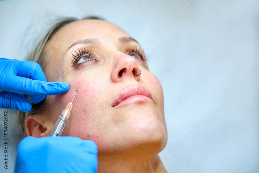 woman over 40 years old undergoing anti-wrinkle aesthetic treatment with hyaluronic acid injection