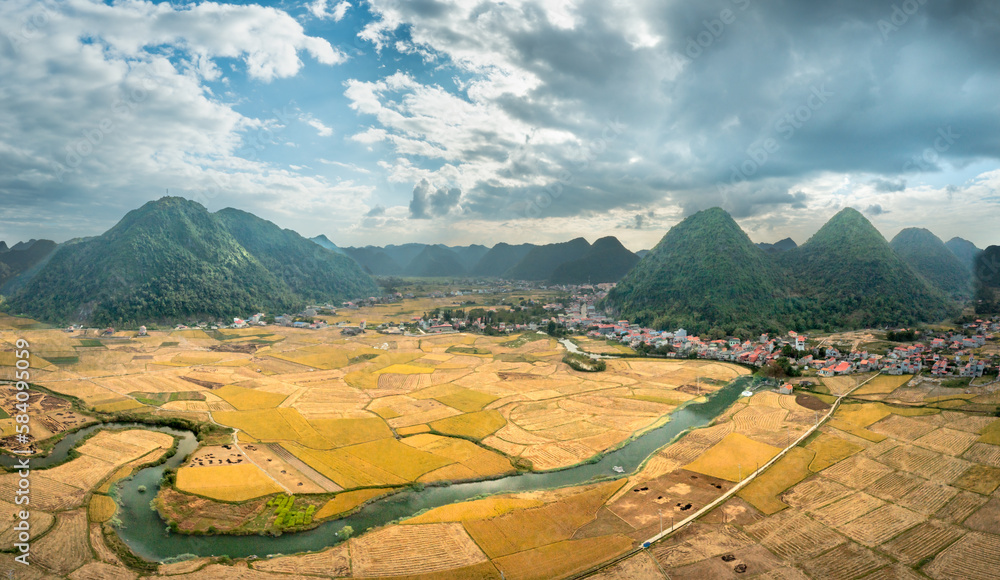 Panoramic view of Bac Son valley during the ripe rice season. View from the top of Na Lay mountain, Bac Son district, Lang Son province, Vietnam