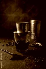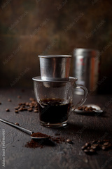 Preparation of Vietnamese coffe with aluminum cofe filer on dark background