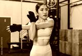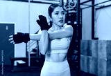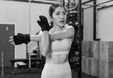 Asian young muscular fit strong body sporty athletic sexy female fitness workout sports bra leggings gloves concentrate standing holding hands arms stretching in Crossfit gym with equipment