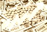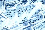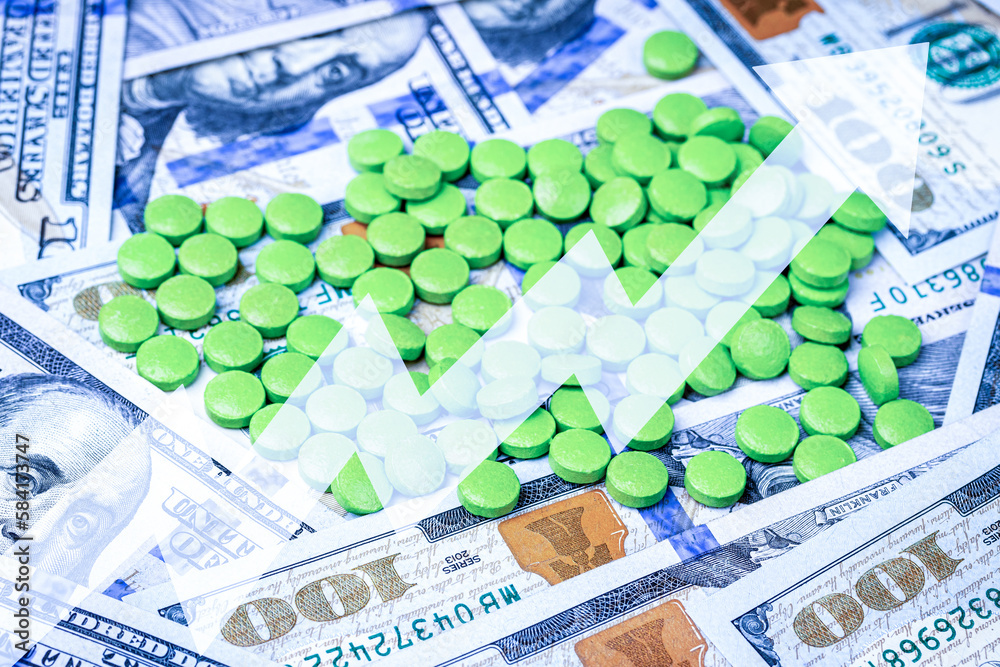 Medicine pills or capsules with dollars and arrow up. The concept of growth in the production of medicine pills or prices for them. Growth in sales, demand and purchases.