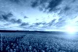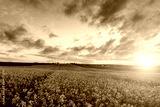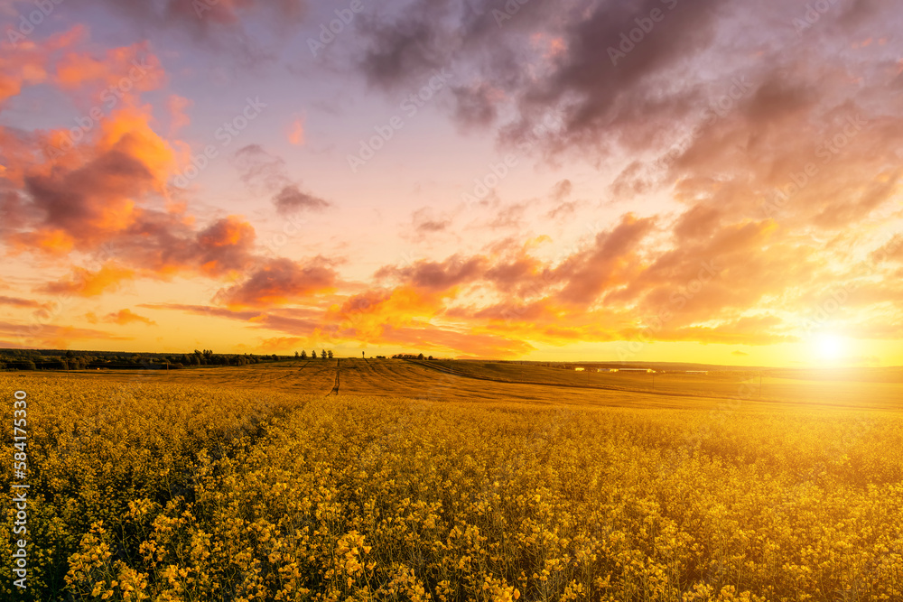 Agricultural flowering rapeseed field at sunset or sunrise.