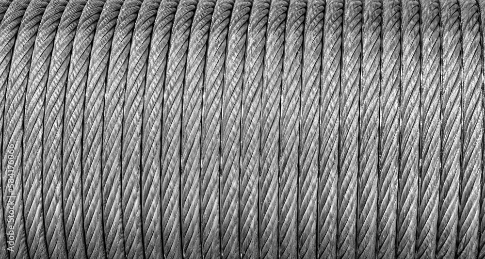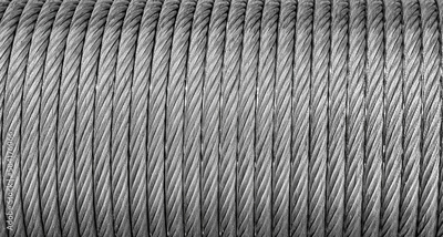 The texture of a new stainless steel cable wrapped in a spool. Abstract background.